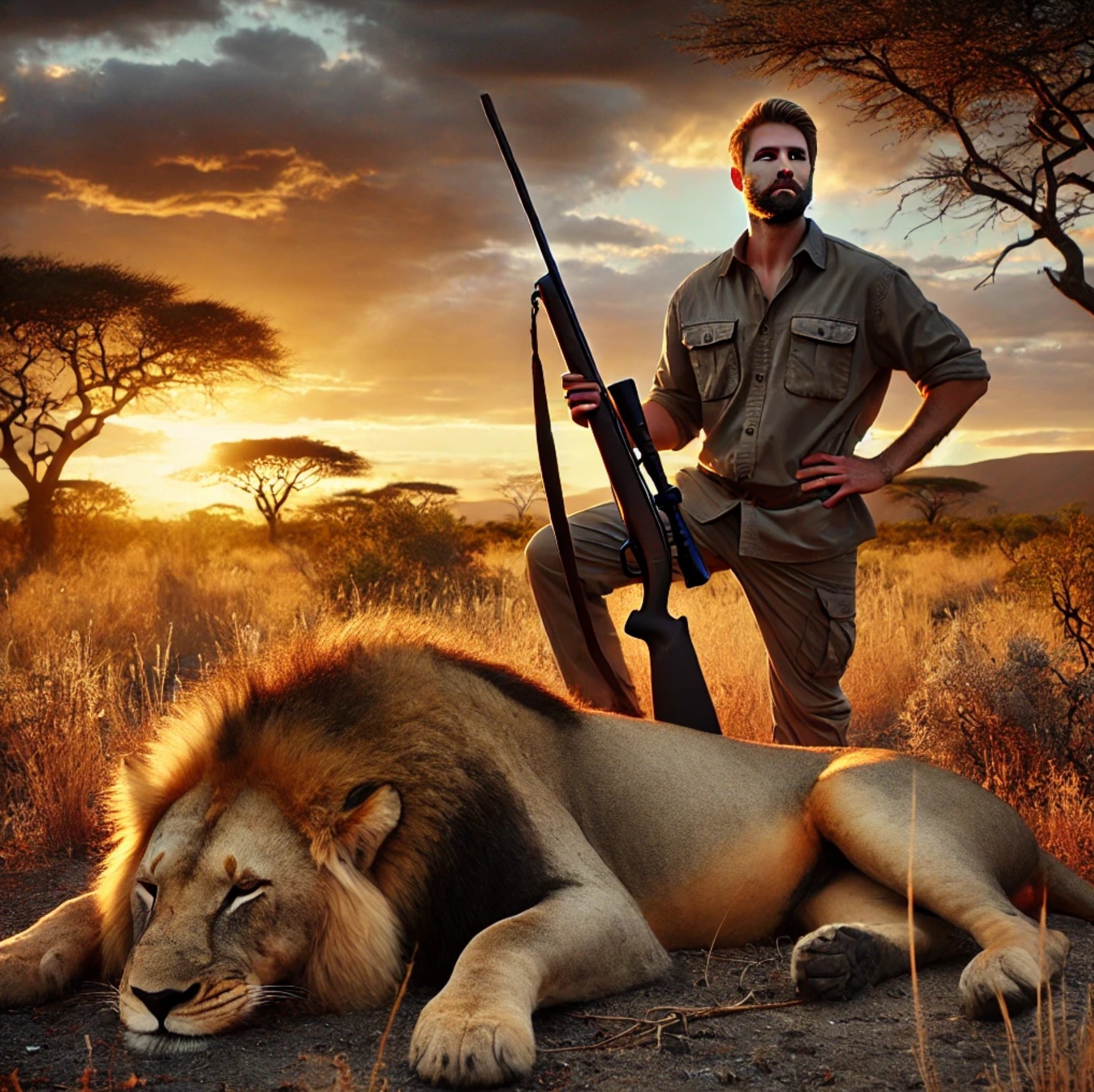 Most of the generated images depict a man dressed in an outfit with safari or camouflage patterns, holding a rifle, standing with a proud expression and stance. The background often features a savannah, bathed in the reddish glow of a setting sun. With this romanticized backdrop, the man stands next to a large animal that is posed to appear submissive to humans, having lost its wildness. This posture, which is manipulated as if it is alive despite being dead, closely resembles real trophy hunting photos that can be found through a Google search. In other words, all the visual grammar is similarly reflected.