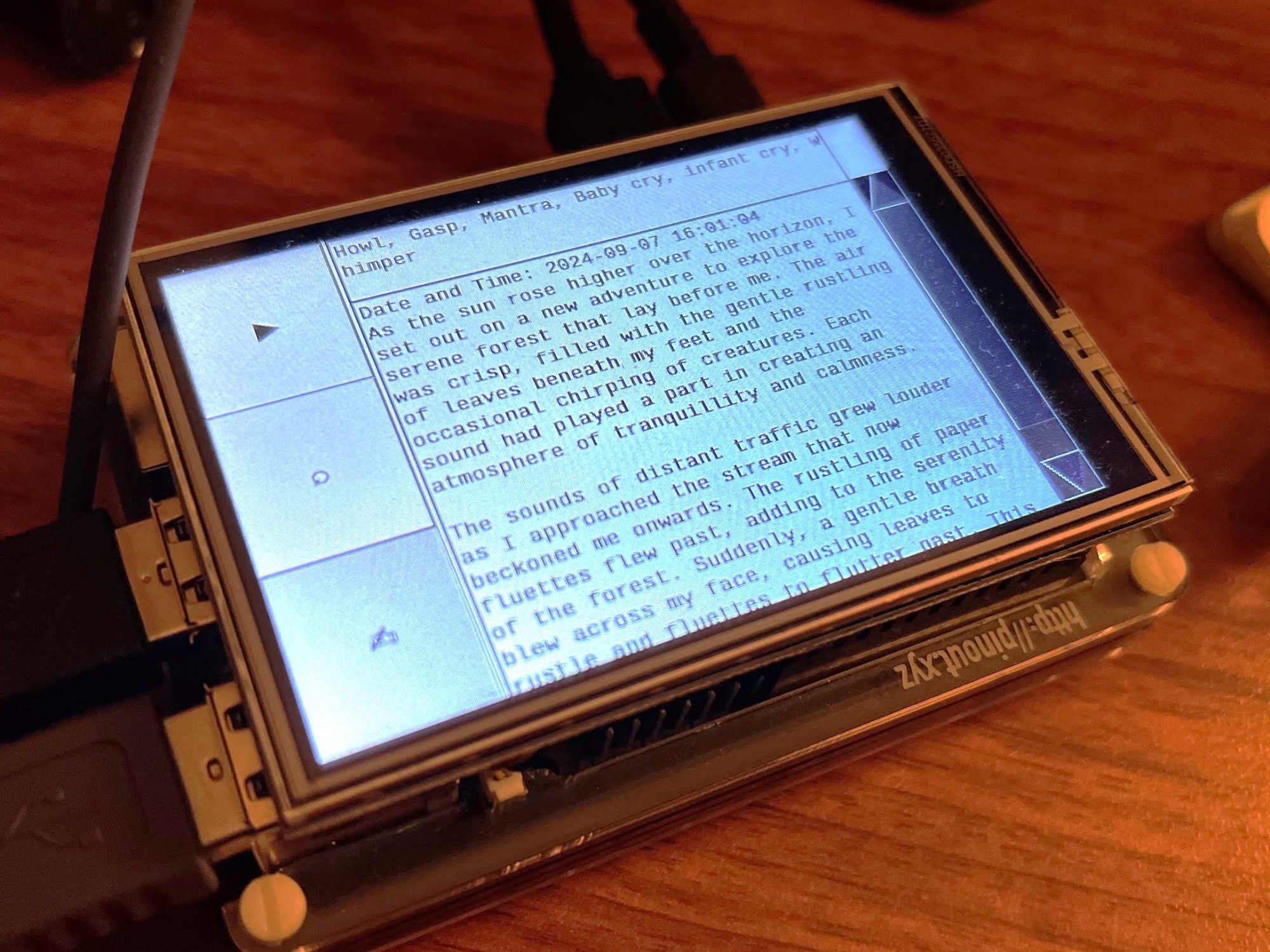 이 모든 질문들은 콩코디아 대학(Concordia University) 밀리유 인스티튜트(Milieux Institute)의 GenAI 스튜디오 이니셔티브 및 2024년 8월 뮤텍 포럼(MUTEK Forum)의 와일딩 AI 랩(Wilding AI Lab)에서 이어진 공개 프레젠테이션의 일환으로 진행된 프로젝트의 기술 개발에 반영되었다. 레지던시 기간 동안, 우리는 내장된 기계학습 모델을 소형 컴퓨터 장치에 활용한 프로토타입 에이전트인 ‘라즈베리 파이 5 (Raspberry Pi 5)’를 개발했다. 이 에이전트 장치 파이(Pi)는 마이크, 스피커, 생성음과 소형 언어 모델을 통해 주변 환경과 소통할 수 있으며, 대규모 디지털 인프라로부터 완전히 독립적으로 운영될 수 있도록 배터리 방식으로 작동한다.