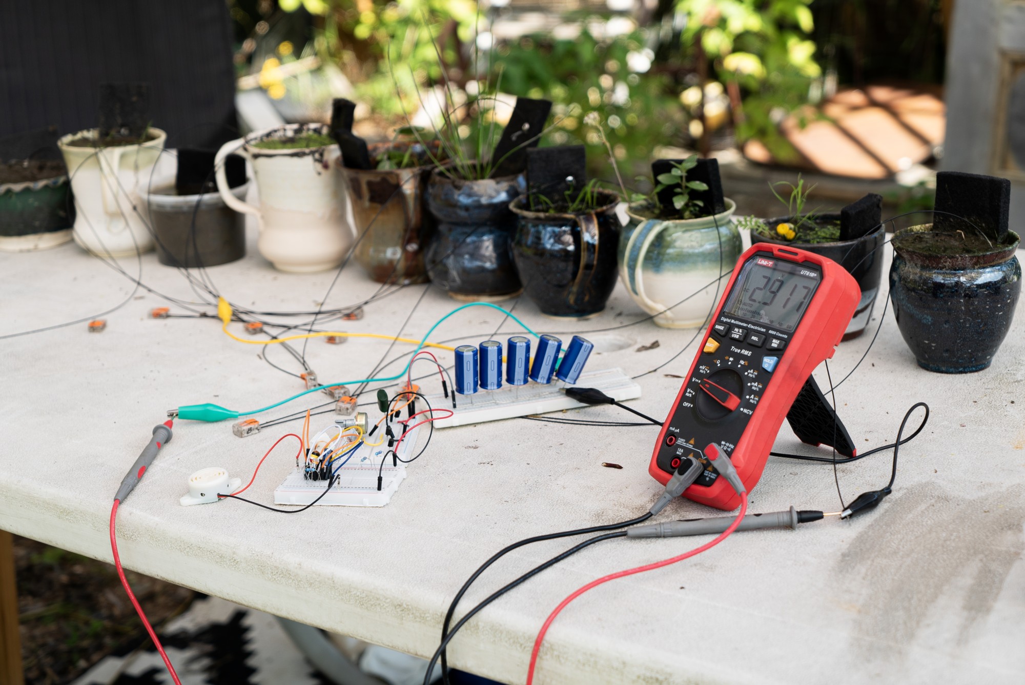 The circularity of the main catalysts for electricity generation—soil, bacteria, and plants—is central to this project. The challenge lies in understanding the ecological systems that drive electrogenesis in wet soil. Equally important are the material experiments aimed at building energy-harvesting infrastructures, such as waterproof containers, electrical wiring, and electrodes. This requires a careful examination of the global supply chain of both natural and synthetic materials. Each component in the experiments is evaluated in terms of how it is produced, used, and discarded, to develop a holistic understanding of the system being enabled—and the one being replaced. Additionally, I have experimented with electronic systems designed to operate on the low voltage and low current provided by bacterial electricity.