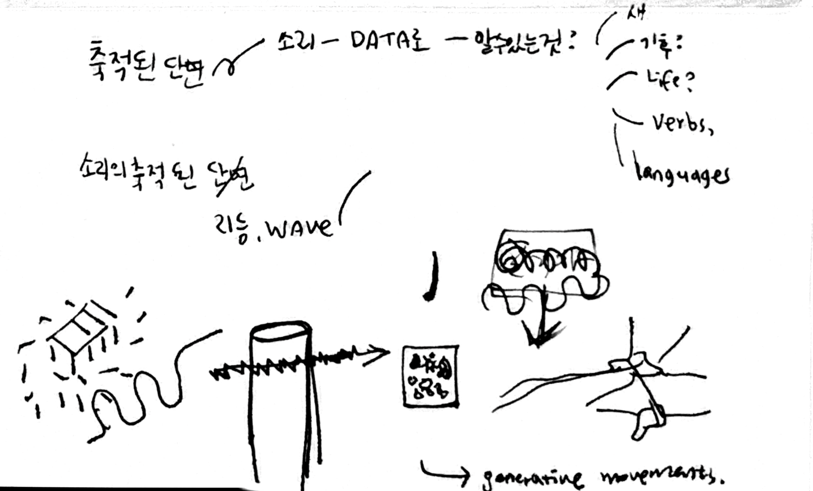 축적된 시간성을, 필드 레코딩한 사운드를, 현재와 동기화하고, 녹음된 리듬을 바탕으로, 다시 현재성을 가지도록 만들기 위한 사운드 연구를 진행. 일반적으로 시간 축으로 인식되는 사운드 합성 방법론에서 주파수 영역에 접근하여, 숨겨진 패턴을 청각적으로 구현할 방법들에 대한 연구.