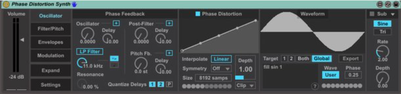 Phase Distortion Synthesis changes the phase angle of a sine wave with a second modulator wave to generate various waveforms. Although similar to FM synthesis, the key difference between these two methods is that in Phase Distortion Synthesis, the two waveforms synchronize at each cycle, producing more harmonics. In other words, the sine wave can be distorted until it becomes a sawtooth wave, triangle wave, square wave, etc. This synthesis engine, which goes beyond just waveform generation, typically follows a subtractive synthesizer design.
